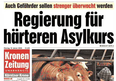 Nun werden Schlagzeilen aber von Menschen aufgenommen, die eine Meinung haben. Und lediglich ein einziges Wort kann zwischen Zustimmung und Ablehnung den Unterschied herstellen. Am Beispiel der Kronen-Zeitung vom 12. Jänner kann man das erkennen. Dabei handelt es sich um eine von der Regierung beschlossene Verschärfung des Asylrechts.